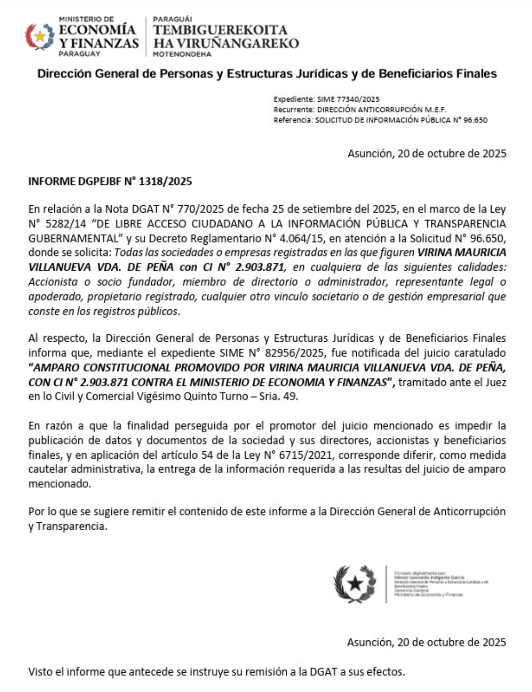 En octubre de 2025, Parámetro solicitó al Ministerio de Economía y Finanzas (MEF) información sobre las empresas y beneficiarios finales vinculados a Villanueva.