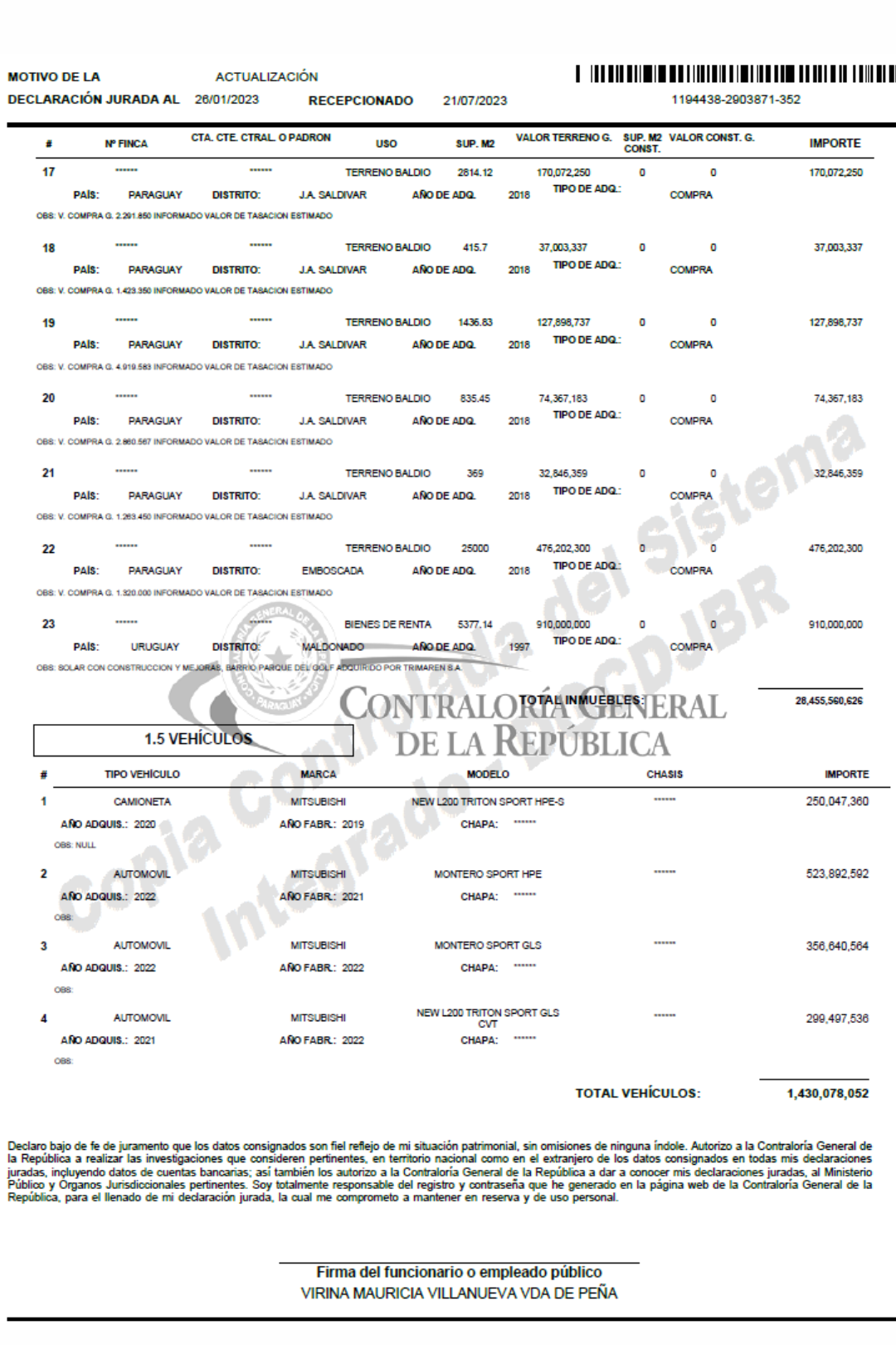 Entre 2007 y 2018, Virina Villanueva adquirió más de diez propiedades en Caacupé, San Bernardino, Altos, Emboscada y Ciudad del Este, además de una sociedad en Uruguay, Trimaren S.A..